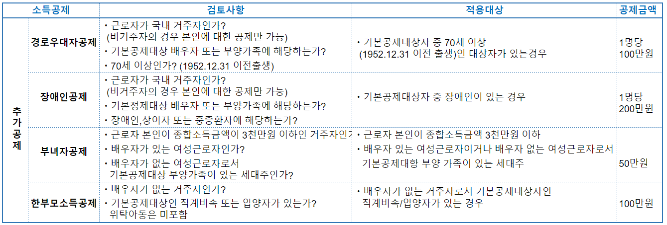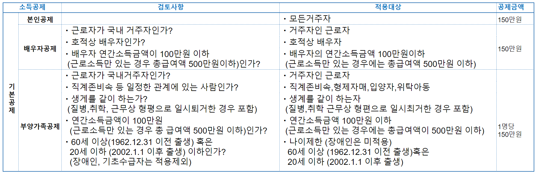 다양한 소득공제항목 중 가장 기본적인 공제 항목으로, 크게 기본공제와 추가공제로 나뉩니다.